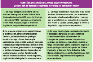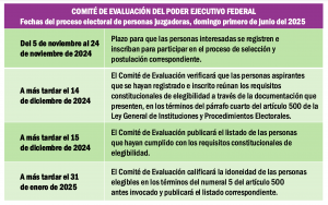 En la convocatoria lanzada por el Comité de Evaluación del Poder Ejecutivo se describen las fechas y plazos del proceso extraordinario de elección de personas juzgadoras, del domingo primero de junio del 2025, son los siguientes: