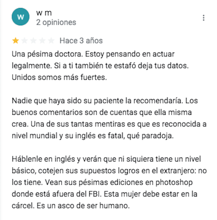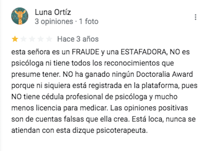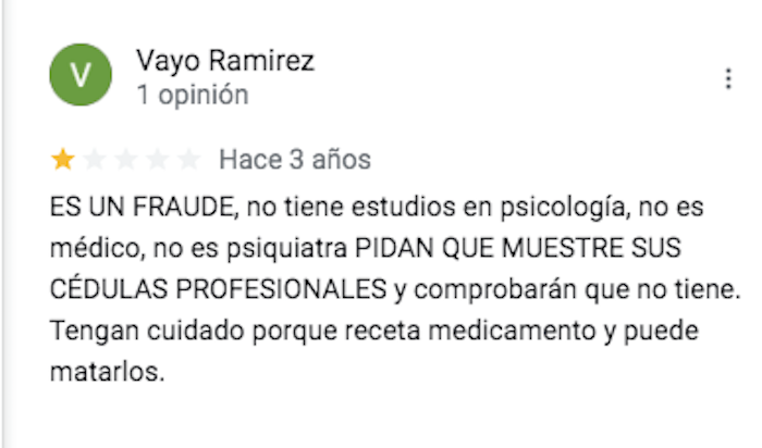 “No caigan en las manos de esta estafadora y usurpadora de profesión. Da diagnósticos sin sustento y receta medicamentos sin licencia, puesto que no tiene cédula como médico psiquiatra, siendo un psiquiatra el único médico facultado para recetar medicamento. Respecto a la terapia, esta persona NO ofrece terapias estructuradas. Solo recomienda hacer ejercicio, te insulta y te diagnostica como narcisista o como psicótico”, opinó el usuario identificado como S PD.