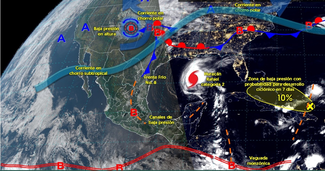 Las autoridades destacaron que se originará el frente frío número diecinueve al noreste del país, el cual gradualmente se desplazara al oriente, además de un canal de baja presión sobre el sureste del país, con el ingreso de humedad en el mar Caribe.