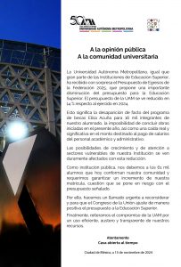 Ante esta situación, la UAM hace un llamado urgente al Congreso de la Unión para que reconsidere y ajuste positivamente el presupuesto asignado a la Educación Superior.
