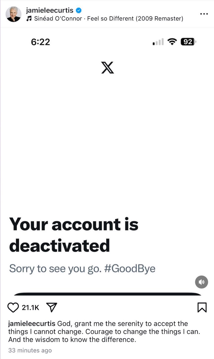 "Dios, concédeme la serenidad para aceptar las cosas que no puedo cambiar. Valor para cambiar las cosas que sí puedo. Y la sabiduría para reconocer la diferencia", escribió Curtis junto a una publicación de Instagram que mostraba que había eliminado su cuenta de X.