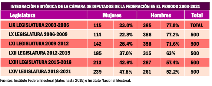 Todavía en la integración de la Cámara de Diputados para el periodo 2018-2021 había un claro predominio de los varones en el Palacio Legislativo de San Lázaro. Aunque el avance hacia la paridad plena era gradual. Para que tengamos una idea clara de los avances que se han experimentado habría que considerar que todavía en los comicios para diputados federales del 2003 las mujeres apenas llegaron a ocupar el 23 por ciento de las curules en el Palacio Legislativo de San Lázaro.