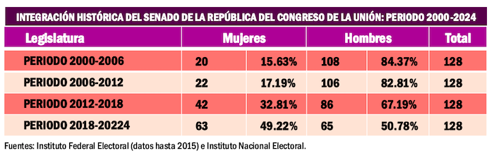 El tramo que recorrieron las mujeres para alcanzar la paridad de género plena en el Senado de la República también fue muy prolongado. Luego de los comicios del 2000 los escaños para las mujeres apenas representaban el 15.63 por ciento del total.