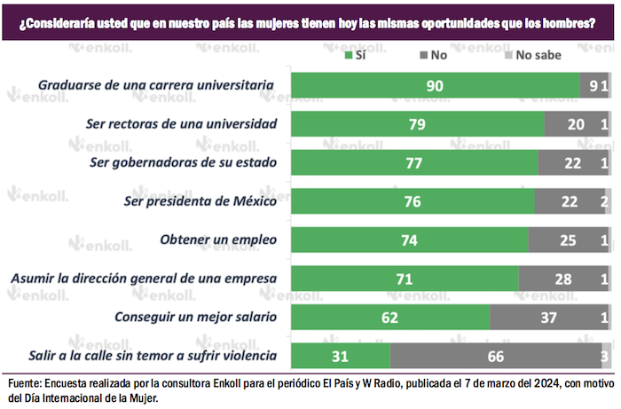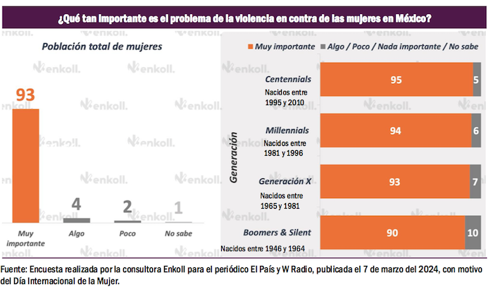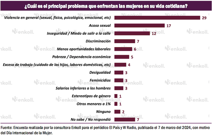 El principal problema que las mujeres mexicanas perciben en su entorno y en su vida cotidiana es la violencia, sexual, física, sicológica, emocional, según revela la última encuesta realizada por la consultora Enkoll para el diario El País y para W Radio.