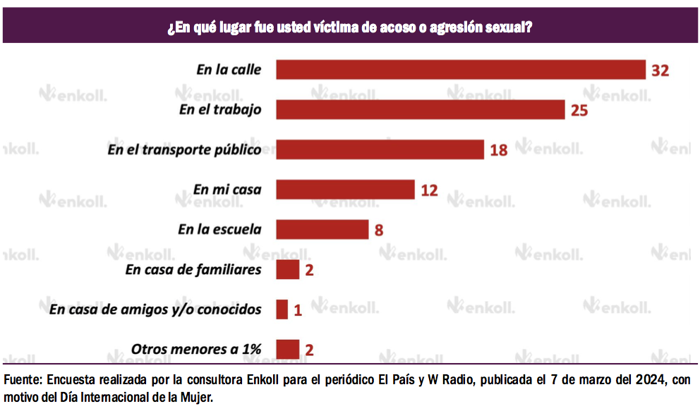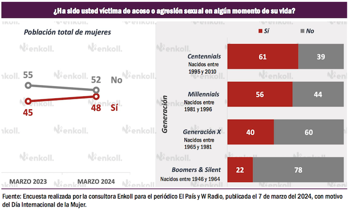 El 48 por ciento de las mujeres entrevistadas en la encuesta de Enkoll señala que en el algún momento de su vida fue objeto de acoso o agresión sexual y el escenario de las afectadas abarca todas las generaciones, desde niñas de 14 años hasta personas de la tercera edad. El problema es muy grave, considera el 93 por ciento de las mujeres afectadas.