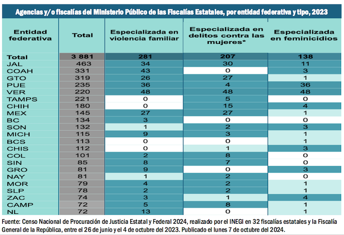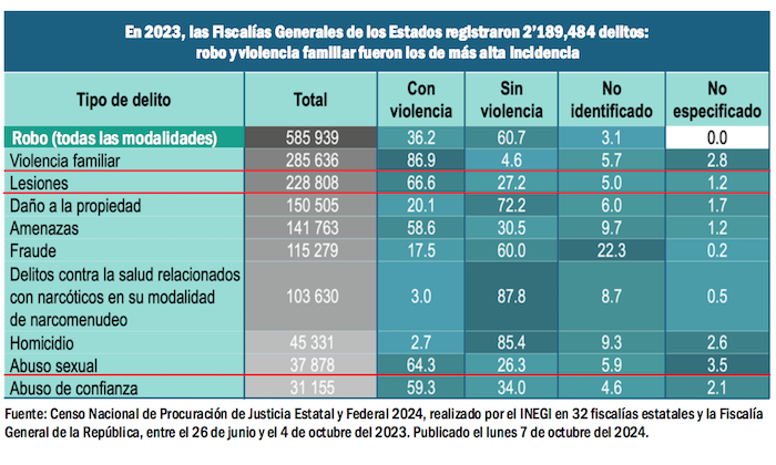 El segundo delito del fuero común más frecuente en los estados de la República es la violencia familiar y en tercero, las lesiones. Estos dos últimos suelen ir vinculados. Lo preocupante es que con respecto a los delitos de los cuales son víctimas las mujeres, la mayoría de las fiscalías del país no muestran un especial interés por atenderlos, según los resultados que arroja el Censo Nacional de Procuración de Justicia Estatal y Federal 2024, realizado por el Instituto Nacional de Estadística y Geografía (INEGI) en las 32 fiscalías estatales y en la Fiscalía General de la República, entre el 26 de junio y el 4 de octubre del 2023. Este informe fue publicado el lunes 7 de octubre del 2024.