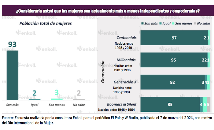 Pero algo ha cambiado en la percepción de la población femenina, y en gran medida se debe a la enorme repercusión que tienen las redes sociales en la difusión de conductas violentas contra las mujeres, pues el 69 por ciento de las entrevistadas en la encuesta de Enkoll considera que con respecto a la situación que prevalecía en el país hace cinco años, actualmente es más probable que se castigue a quienes cometen acoso o abuso sexual. También hay un nuevo ánimo de seguridad y empoderamiento en las mujeres.