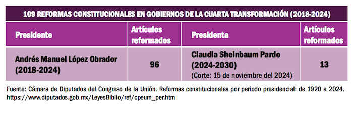 Entre el 2018 y el 2024 los gobiernos de la Cuarta Transformación, encabezados por Andrés Manuel López Obrador y Claudia Sheinbaum Pardo, han promovido reformas a 109 artículos de la Constitución General de la República, orientados a encauzar las acciones de la administración pública en favor de los pobres, que integran la mayoría en el país.