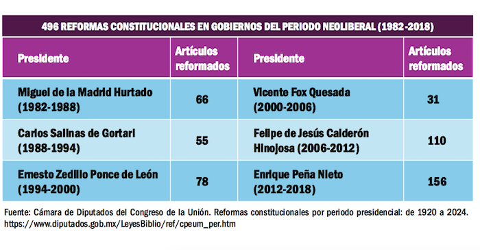 En contraste con las 496 reformas que llevaron a cabo los gobiernos neoliberales entre 1982 y 2018, que desnaturalizaron y traicionaron el proyecto histórico de reivindicaciones sociales gestado en la Revolución Mexicana. Las reformas del periodo neoliberal cambiaron el modelo del País, al iniciar una privatización a ultranza de los bienes de la Nación, con el perverso propósito de empoderar y enriquecer a unos pocos, en detrimento del bienestar de la mayoría.