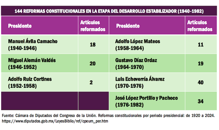 Si observamos las reformas que se hicieron a la Constitución General de la República durante los seis primeros gobiernos surgidos de la Revolución, veremos que los cambios a la Carta Magna fueron pocos y muy cuidadosos. Lo mismo sucedió en el periodo llamado del Desarrollo Estabilizador.