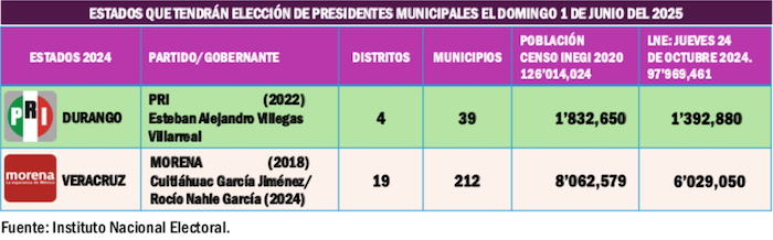 Los antecedentes más inmediatos permiten anticipar que en Veracruz y Durango, en los comicios del primero de junio del 2025, Morena se impondrá como una fuerza muy dominante y ganará la mayoría de las 212 presidenciales municipales que estarán en juego en la entidad del Golfo y superará con comodidad a sus rivales en la disputa de las 39 alcaldías en la entidad norteña.