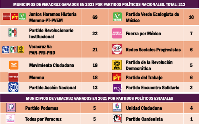 En Veracruz, Morena y sus aliados gobiernan actualmente 103 municipios de los 2012 que tiene la entidad, mientras que sus opositores de PAN, PRI, PRD suman 60 alcaldías. El resto de las presidencias municipales están en poder de partidos nacionales que perdieron su registro en el 2021 y otras en manos de cuatro partidos estatales.