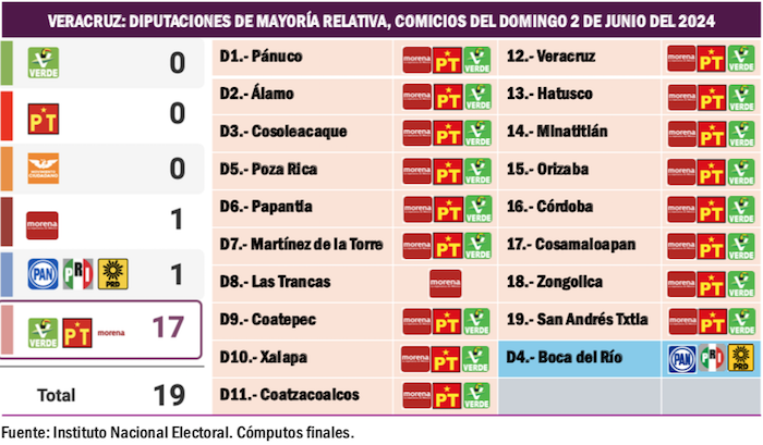 El triunfo de la coalición morenista Sigamos Haciendo Historia en la contienda por los 19 distritos electorales federales fue también aplastante en junio pasado, pues sumó en Veracruz 18 victorias por el Principio de Mayoría Relativa, por sólo una de la coalición Fuerza y Corazón por México.