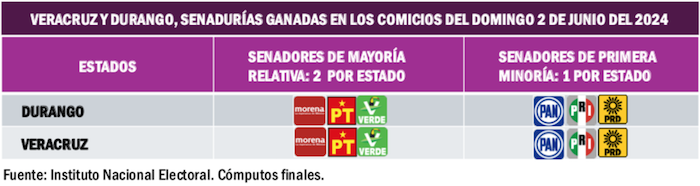 En el caso de Durango, una entidad gobernada por el PRI, la coalición morenista ganó las dos senadurías de Mayoría Relativa que estuvieron en juego y dejó para consuelo de la oposición encabezada por el PAN sólo una senaduría de Primera Minoría. Mientras que en Veracruz la coalición Sigamos Haciendo Historia ganó también las dos senadurías de Mayoría Relativa y dejó a la oposición la senaduría de segundo lugar.