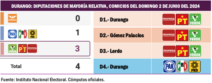 En Durango, estado en el cual se presume que juntos, el PRI y el PAN serían una fuerza respetable, no pudieron imponerle condiciones a Morena y sus aliados. La coalición sigamos haciendo historia ganó tres de cuatro distritos electorales federales.