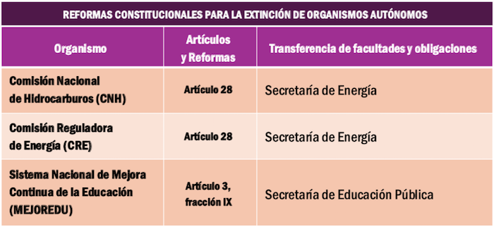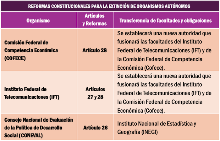 Bajo esta óptica, justificaba el exmandatario, se proponía regresar al Estado atribuciones que fueron delegados a organismos como la Comisión Federal de Competencia Económica (COFECE), el Instituto Federal de Telecomunicaciones (IFT), el Instituto Nacional de Transparencia, Acceso a la Información y Protección de Datos Personales (INAI), el Consejo Nacional de Evaluación de Política de Desarrollo Social (CONEVAL).
