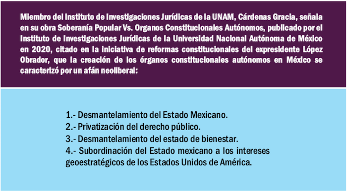 Miembro del Instituto de Investigaciones Jurídicas de la UNAM, Cárdenas Gracia, señala en su obra Soberanía Popular Vs. Organos Constitucionales Autónomos, publicado por el Instituto de Investigaciones Jurídicas de la Universidad Nacional Autónoma de México en 2020, citado en la iniciativa de reformas constitucionales del expresidente López Obrador, que la creación de los órganos constitucionales autónomos en México se caracterizó por un afán neoliberal: