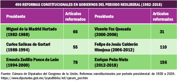 Durante el sexenio de 1989-1994, se reformó la Constitución en sus artículos 27, para abrir al capital privado la generación de energía eléctrica, y 28, para permitir la desincorporación de empresas del Estado consideradas estratégicas y prioritarias, y concesionar la construcción de carreteras a empresas privadas, entre otros objetivos.