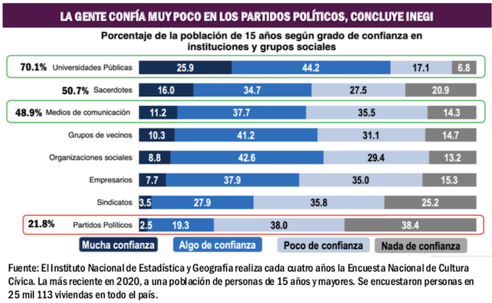 Y explica: “El financiamiento público a los partidos políticos para su aplicación en campañas electorales y actos tendientes a la obtención del voto se convirtió en un requisito indispensable para garantizar contiendas justas y equitativas. Sin embargo, el sostenimiento de su estructura burocrática durante tiempos no electorales nunca ha terminado de justificarse socialmente, dada la proliferación de élites partidistas ajenas al interés público y representatividad ciudadana”. Pone como referencia una encuesta del Instituto Nacional de Estadística y Geografía, sobre Cultura Cívica: