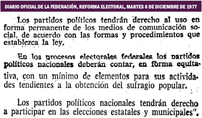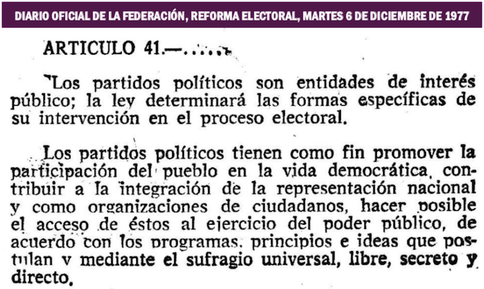 Fue en la Reforma Electoral publicada en el Diario Oficial de la Federación el martes 6 de diciembre de 1977 cuando se reconoció en la Constitución General de la República a los partidos políticos como “entidades de interés público” que podían aspirar al financiamiento del Gobierno. Se advertía, por primera ocasión, que los partidos políticos nacionales deberían contar “en forma equitativa, con un mínimo de elementos para sus actividades tendientes a la obtención del sufragio popular”. Esa iniciativa fue promovida por el secretario de Gobernación, Jesús Reyes Heroles y respaldada por el mandatario priista José López Portillo y Pacheco.