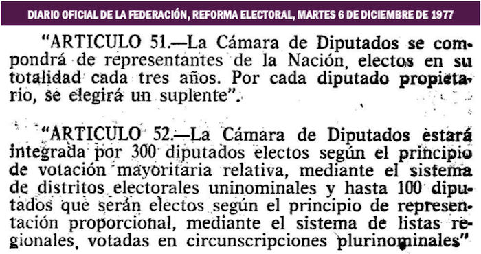Esa reforma fue muy significativa porque estableció además que la Cámara de Diputados del Congreso de la Unión estaría integrada por 300 diputados federales electos por el principio de Mayoría Relativa y 100 más por el principio de Representación Proporcional, asignados en listas regionales, mediante circunscripciones electorales.