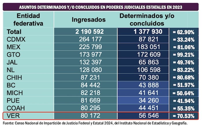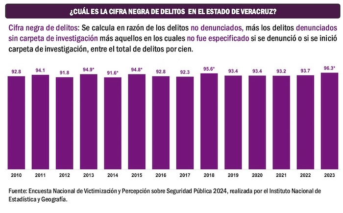 Los índices de impunidad en Veracruz son altos, pues el 96.3 por ciento de los delitos que se cometen no son denunciados y mucho menos investigados. Aún cuando la entidad muestra un razonable porcentaje de eficiencia en la administración de justicia que depende del Poder Judicial del Estado.