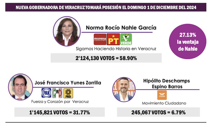 La nueva Gobernadora de Veracruz, Nahle García, llegará con todo a su favor, pues además de que su partido ganó la mayoría aplastante en el Congreso del Estado, lo que le permitirá promover hasta reformas constitucionales sin obstáculo alguno a la Carta Magna de la Entidad, Morena y sus aliados tendrán también una muy relevante representación de legisladores federales en el Congreso de la Unión. La nueva mandataria llega al gobierno luego de lograr una victoria con una amplia ventaja de más de 27 puntos sobre su principal rival, el panista José Francisco Yunes Zorrilla. La coalición de Morena, PT y PVEM es una fuerza dominante en Veracruz, que se ha convertido en una entidad clave para el proyecto de la Cuarta Transformación.