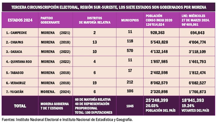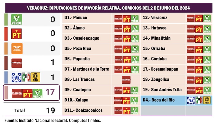 Veracruz es una entidad politicamente clave para Morena y para el gobierno de la Cuarta Transformación, pues es el referente principal de la Tercera Circunscripción Electoral, región Sur-Sureste, en la cual los siete gobiernos estatales que la integran están en manos del partido gobernante y de sus aliados. En esta región, de 60 diputaciones federales de Mayoría Relativa que estuvieron en juego el pasado domingo 2 de junio del 2024, la coalición Sigamos Haciendo Historia ganó 58 y sus rivales de PAN-PRI y PRD apenas pudieron quedarse con dos distritos, uno con cabecera en Boca del Río, Veracruz y otro con cabecera en la ciudad de Mérida, Yucatán. Pero en el estado de Veracruz, la presencia de Morena fue tan dominante que ganó 18 de los 19 distritos electorales federales que se disputaron en junio pasado.