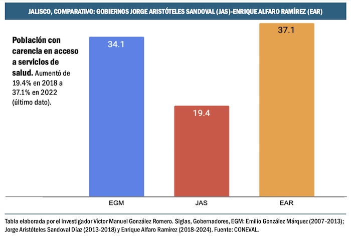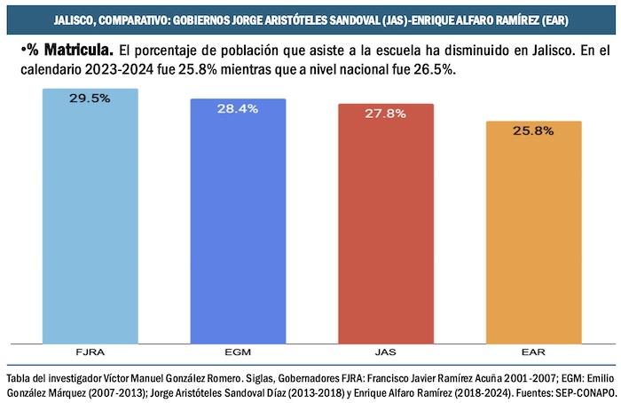 En Salud, los indicadores nos dice que Jalisco está por debajo de la media nacional. En educación los datos también reflejan que Jalisco ha tenido retroceso en la matrícula de alumnos y también aumentó el rezago educativo, más alto que en el ámbito nacional. En economía, el salario promedio de cotización de trabajadortes en el Seguro Social es el más bajo que a nivel nacional, esto es malo para un estado que se considera tan pujante como Jalisco. “El sexenio de gobierno de Enrique Alfaro fue muy malo, pues estuvimos más mal que el país”, considera González Romero.