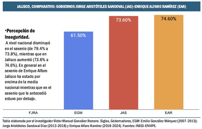 La percepción de inseguridad en Jalisco, en el cierre del anterior sexenio de Jorge Aristóteles Sandoval era del 73.6 por ciento. El último dato en el cierre de la administracipón de Enrique Alfaro es del 74.3 por ciento de percepción de inseguridad en Jalisco. En impunidad, el índice de los delitos que no son investigados, es del 99.1 por ciento y sólo Oaxaca supera a Jalisco en impunidad, cuando la media nacional del índide de impunidad es de 96 por ciento, agrega el investigador universitario.