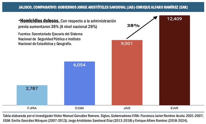 “Durante la gestión de Enrique Alfaro fueron asesinadas 56 por ciento más personas que en la gestión de Aristóteles Sandoval; incluso éste último se encuentra entre las víctimas registradas este sexenio. Datos del Secretariado Ejecutivo del Sistema Nacional de Seguridad Pública señalan que en la gestión del priista, de 2013 a 2018, se registraron 8 mil 575 víctimas de homicidio doloso. En tanto, con el emecista, en el periodo que va de diciembre de 2018 a septiembre de 2024, los criminales perpetraron 13 mil 346 asesinatos, según las mismas cifras oficiales, publicó el pasado viernes 29 de noviembre el periódico Mural.