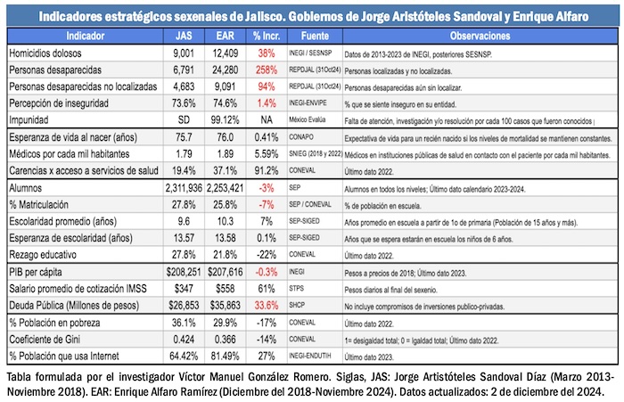 Sin embargo, para el exrector de la Universidad de Guadalajara (1995-2001) y ex secretario de Planeación del gobierno de Jalisco (2007-2011), el ingeniero químico con doctorado por la Universidad de Minnesota, Victor Manuel González Romero, los principales indicadores en materia de seguridad, salud, educación y economía, contradicen las presunciones y el optimismo del mandatario jalisciense que este jueves 5 de diciembre del 2024 terminará su mandato en Jalisco.