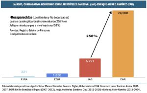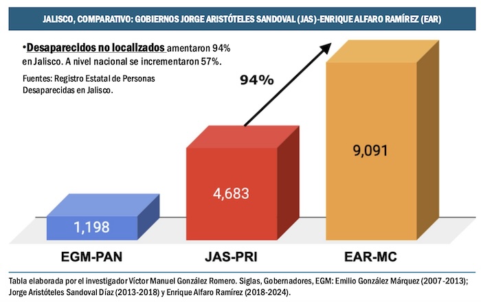 En el sexenio de Enrique Alfaro, hasta el día de hoy, se han registrado 24 mil desaparecidos, cuando con el priista Jorge Aristóteles Sandoval desaparecieron menos de 7 mil, el incremento ha sido del 258 por ciento. Los desaparecidos en el registro histórico de Jalisco son 33 mil, pero más de 9 mil desaparecidos en este sexenio no han sido localizados