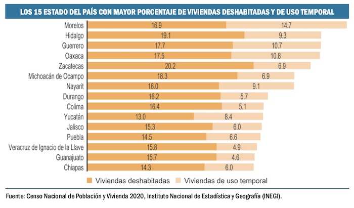 Con un menor peso relativo de viviendas deshabitadas se identifican Baja California (9.0 por ciento) y Ciudad de México (6.8 por ciento). En cuanto a las viviendas particulares de uso temporal, Morelos tiene el mayor peso relativo (14.7 por ciento), seguida por Oaxaca (10.8 por ciento) y Guerrero (10.7 por ciento); en cambio, las entidades que presentan la menor proporción de este tipo de viviendas son Aguascalientes (3.7 por ciento) y la Ciudad de México (2.4 por ciento).