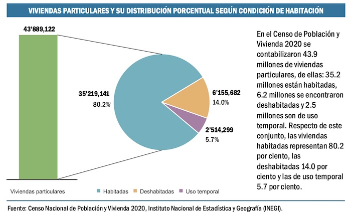 En el Censo de Población y Vivienda 2020 se contabilizaron 43.9 millones de viviendas particulares, de ellas: 35.2 millones están habitadas, 6.2 millones se encontraron deshabitadas y 2.5 millones son de uso temporal. Respecto de este conjunto, las viviendas habitadas representan 80.2 por ciento, las deshabitadas 14.0 por ciento y las de uso temporal 5.7 por ciento.