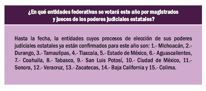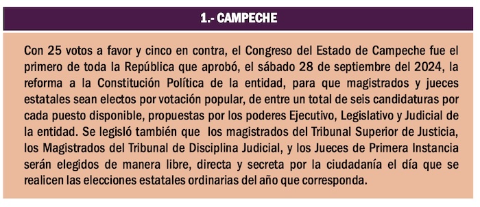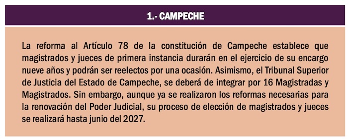 Ciudad de México, 13 de enero (SinEmbargo).- Hasta la fecha, son 16 las entidades de la República que ya llevaron a cabo las reformas necesarias en sus constituciones política estatales para la renovación de sus poderes judiciales locales, mediante el voto directo para elegir magistrados y jueces. En 15 de esas 16 entidades el proceso electoral judicial estatal se realizará el primero de junio del 2025 y en el caso particular de Campeche se llevará a cabo hasta el domingo 6 de junio del 2027.
