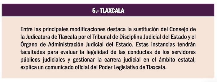 Hoy veremos los casos de nueve entidades en las cuales ya se llevó a cabo la reforma constitucional para renovar sus poderes judiciales estatales y los términos en los que fue aprobada.