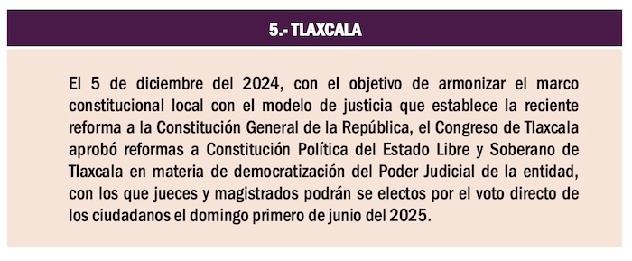 Mañana observaremos en detalle los casos de otros siete estados en los cuales ya se llevó a cabo la reforma al Poder Judicial, para elegir magistrados y jueces en el ámbito local el primero de junio del 2025. Y también los casos de algunos congresos estatales que se resisten a acatar las disposiciones de la Constitución General de la República. Faltan todavía la mitad de las 32 entidades del país en incoprorarse a este proceso, pero todavía tienen de margen para hacerlo hasta el viernes 14 de marzo del 2025.