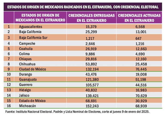 Las estadísticas actualizadas por el Instituto Nacional Eelectoral hasta la segunda semana de enero del 2025 muestran que los estados de la República que tienen más ciudadanos en el Padrón Electoral de Residentes en el Extranjero son Michoacán, Jalisco, Ciudad de México, Guanajuato y Guerrero.