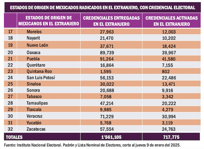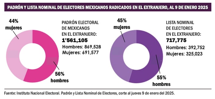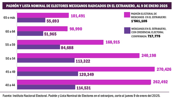 El Padrón Electoral de Mexicanos Residentes en el Extranjero, personas que ya solicitaron e hicieron trámites para obtener su credencial de elector, es de 1 millón 561 mil 105 personas, según el dato más reciente actualizado por el Instituto Nacional Electoral, con corte hasta el jueves 9 de enero del 2025. De esos solicitantes, el INE tiene confirmado que por lo menos 717 mil 775 ya activaron su credencial en el extranjero y estarían en posibilidades de votar. Pero todavía habría tiempo, los cuatro próximos meses, para que aumentara la Lista Nominal de Electores para los comicios de junio del 2025.