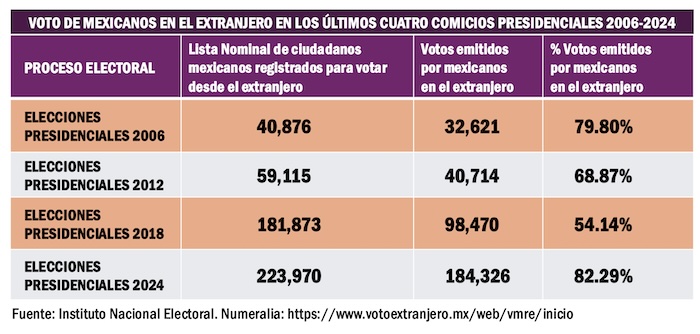 Los referentes históricos de la participación electoral de los mexicanos que residen en el extranjero muestran que en los cuatro comicios presidenciales más recientes han ido aumentando su presencia. Sin embargo, las estadísticas están todavía muy lejos de reflejar la potencia electoral de los compatriotas que viven fuera de nuestras fronteras, pero, particularmente, de quienes residen en Estados Unidos. El 82.29 por ciento de los mexicanos residentes en el extranjero, que se inscribieron en la Lista Nominal de Electores, se hizo presente en los comicios del pasado junio del 2024 para imponer récord de participación, según los datos definitivos consolidados por el Instituto Nacional Electoral y actualizados hasta el reciente viernes 30 de agosto del 2024.