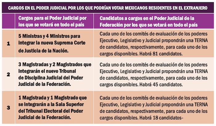 Como sucedió en los comicios de junio del 2024, cuando los residentes en el extranjero sólo pudieron sufragar por los candidatos que fueron votados en todo el país, para la Presidencia de la República y para el Congreso de la Unión (diputados federales y senadores), así como por candidatos a algunas gubernasturas, en junio del 2025, los mexicanos en el extranjero podrían expresar sus preferencias por algunos de los aspirantes al Poder Judicial de la Federación por los cuales se sufragará en todo el país, como son los casos de los 81 candidatos a ministros; los 45 aspirantes a magistrados del Tribunal de Discriplina Judicial y por los dos candidatos a magistrados de la Sala Superior del Tribunal Electoral del Poder Judicial de la Federación.
