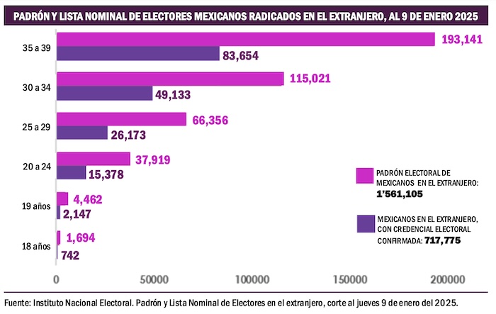 Hasta la fecha, los segmentos de potenciales votantes más numerosos en el extranjero corresponden a personas de entre 35 y 54 años, en tanto que los de menor presencia son los que integran a ciudadanos de 18 a 25 años de edad.