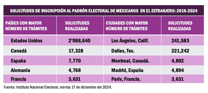 Según el balance del Instituto Nacional Electoral, desde el 2016 hasta el 30 de noviembre del 2024, esa institución había recibido 2 millones 146 mil 461 solicitudes de trámite de la Credencial para Votar Desde el Extranjero. Esto muestra que los mexicanos que radican fuera del país están ninteresados en participar en los comicios, pero que la respuesta de las autoridades mexicanas para atenderlos ha sido insuficiente.