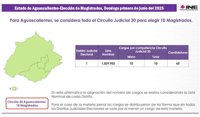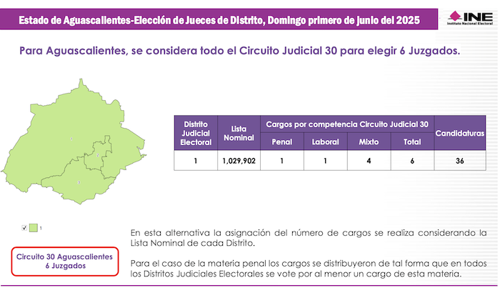 La Lista Nominal de Electores apenas rebasa el millón de votantes potenciales y a esa entidad corresponde el Trigésimo Circuito Judicial, en el cual se votará por 10 Magistrados de Circuito. Aguascalientes que en elecciondes ordinarias tiene tres distritos electorales federales, será en los comicios judiciale un solo Distrito Judicial Electoral en el cual se sufragará por 6 Jueces de Distrito.