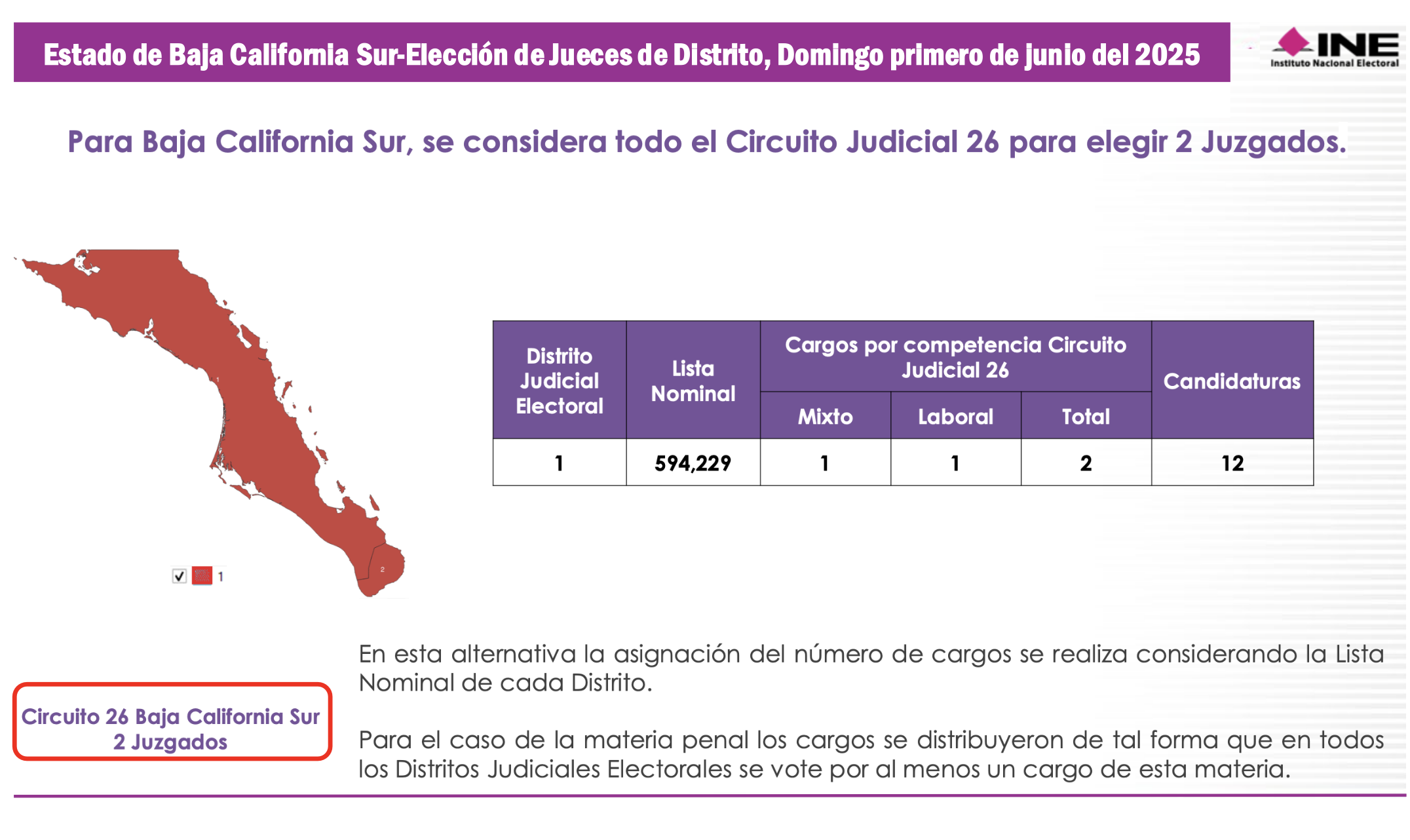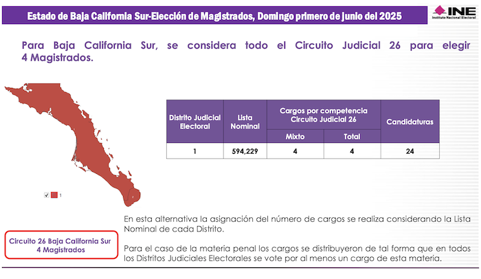 Con una Lista Nominal de apenas 594 mil 229 electores, el estado de Baja California Sur comprende el Vigésimo Sexto Circuito Judicial de la República, en el cual se votará por 4 Magistrados de Circuito. En elecciones ordinarias Baja California Sur incluye dos distritos electorales federales, sin embargo, para los comicios judiciales su territorio se compactará en una sola demarcación denominada Distrito Judicial Electoral, en la cual se sufragará por 2 Jueces de Distrito.