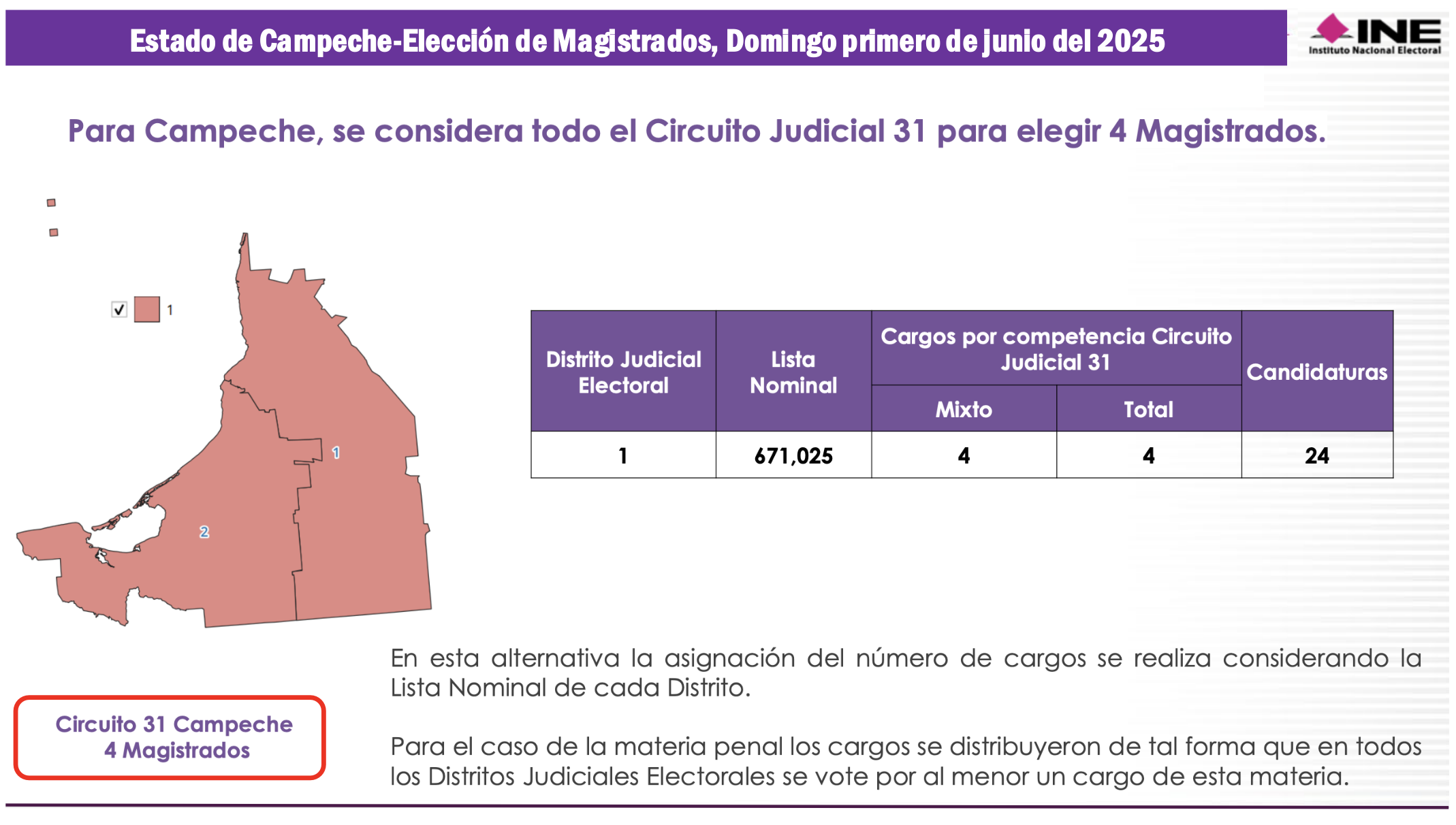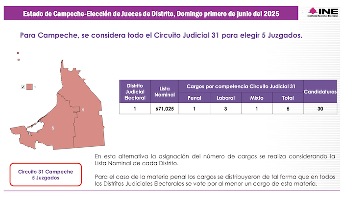 El estado de Campeche, que representa el Trigésino Primer Circuito Judicial, tiene apenas 671 mil 25 electores potenciales. En ese territorio se votará por 4 Magistrados de Circuito. Campeche, que regularmente tiene dos distritos electorales federales se compactará en un solo Distrito Judicial Electoral en el cual se sufragará por 5 Jueces de Distrito.