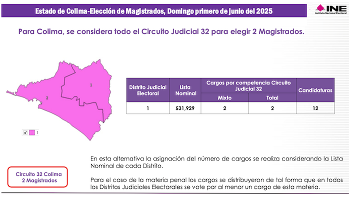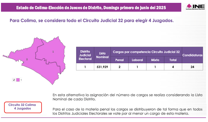 Finalmente, Colima es el estado más pequeño de la República con apenas 531 mil 929 electores potenciales y representa el Trigésimo Segundo Circuito Judicial del país, en el cual se votará por 2 Magistrados de Circuito el próximo domingo 2 de junio del 2025. En elecciones ordinarias Colima tiene dos distritos electorales federales, pero en los comicios judiciales su territorio será compactado en un solo Distrito Judicial Electoral en el cual se votará por 4 Jueces de Distrito.