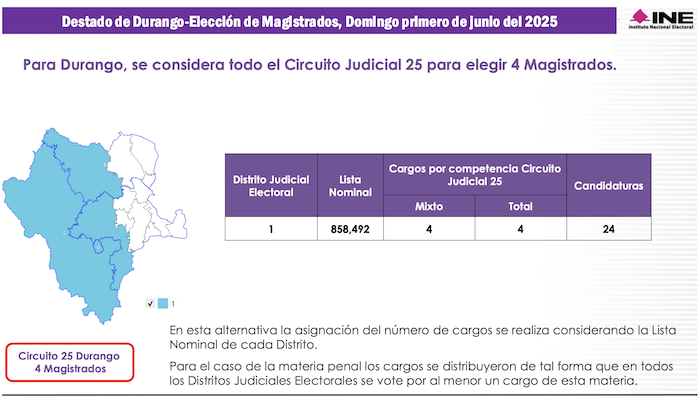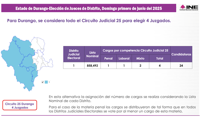Esta entidad comprende el Vigésimo Quinto Circuito Judicial, en el cual se elegirán 4 Magistrados de Circuito. En elecciones ordinarias Durango tiene 4 distritos electorales, sin embargo, para los comicios judiciales se compactará como un solo Distrito Judicial Electoral en el cual serán electos 4 Jueces de Distrito.