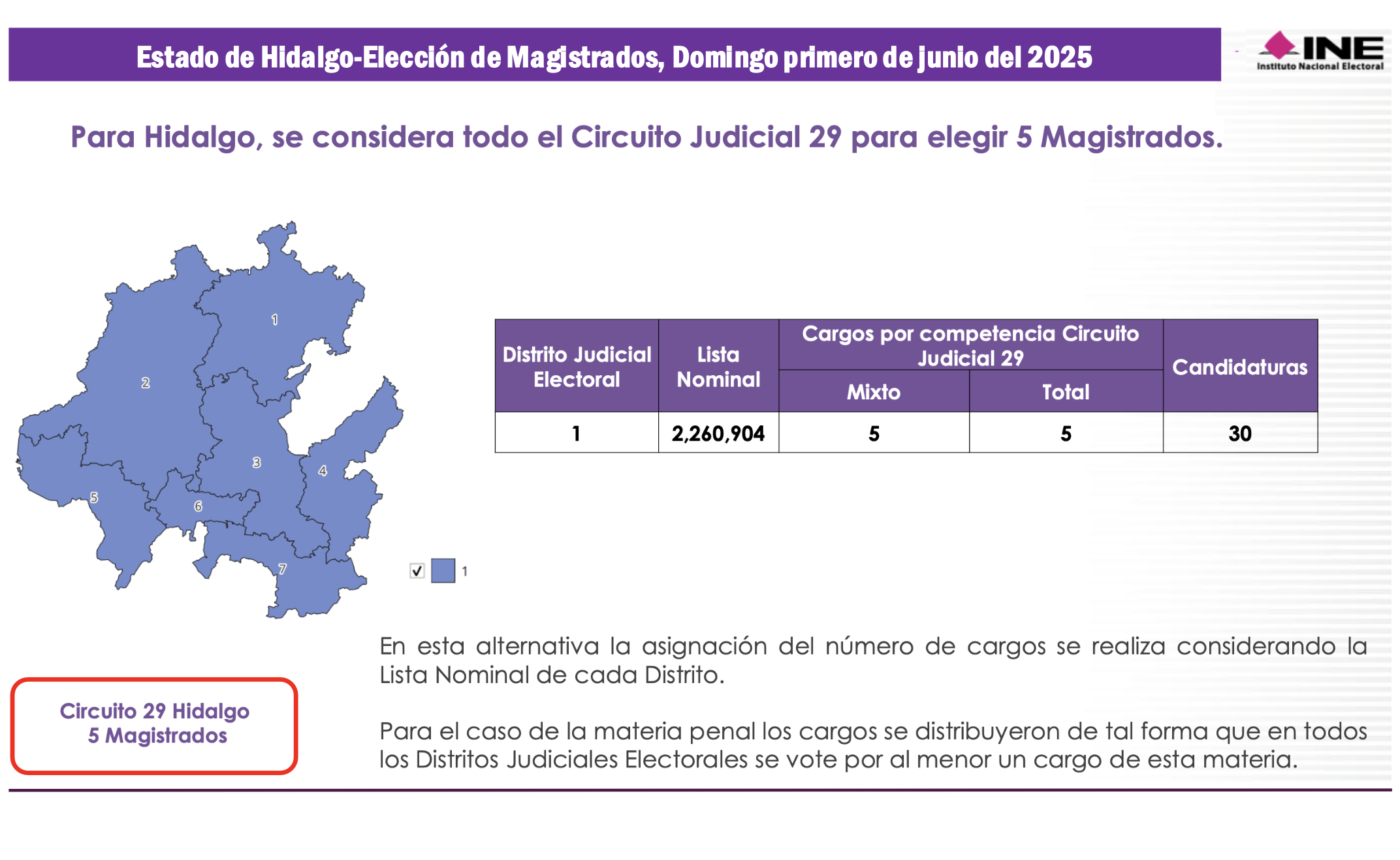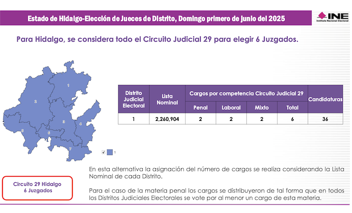 El Vigésimo Noveno Circuito Judicial incluye todo el territorio del estado de Hidalgo, donde se votará en junio por 5 Magistrados de Circuito. Regularmente Hidalgo tiene siete distritos electorales federales, pero en los comicios judiciales será compactado como un solo Distrito Judicial Electoral en el cual se votará por 6 Jueces de Distrito. Hidalgo tiene una Lista Nominal de Electores de 2.2 millones de votantes potenciales.
